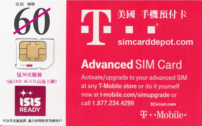 T-Mobile美國預付卡 (Iphone5/6/6s)無限通話簡訊&上網服務(前13GB 4G/LTE高速上網)包30天(Nano sim卡)