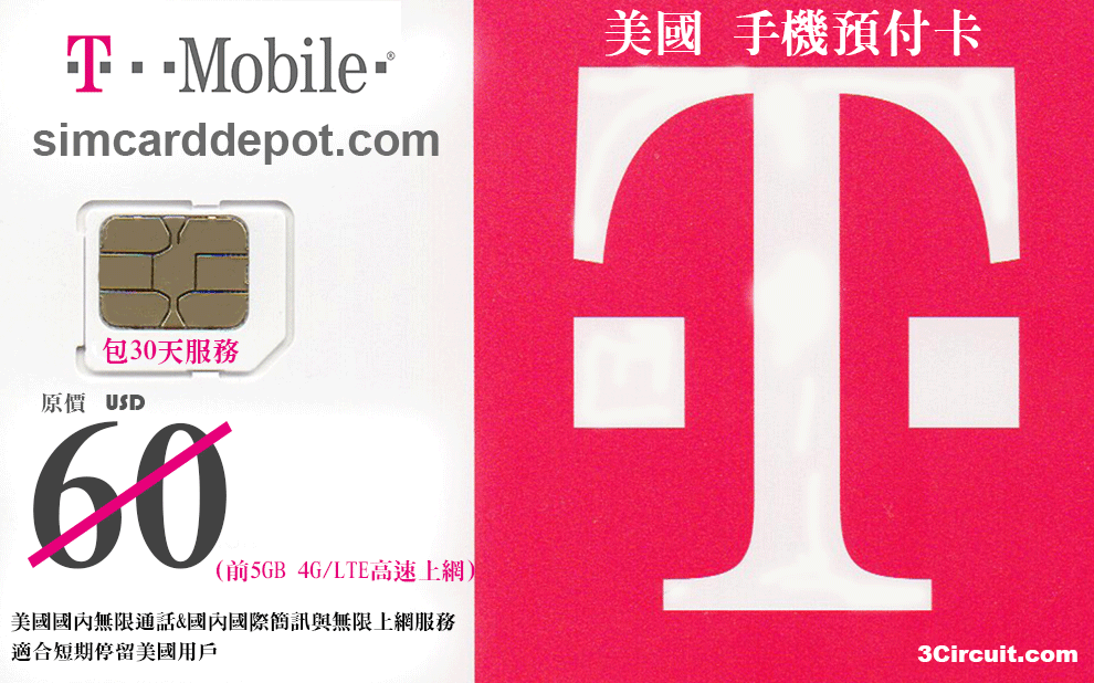 - 美國預付卡 套餐 包一個月30天 $60 美元 (價值約 NT $1920 台幣)